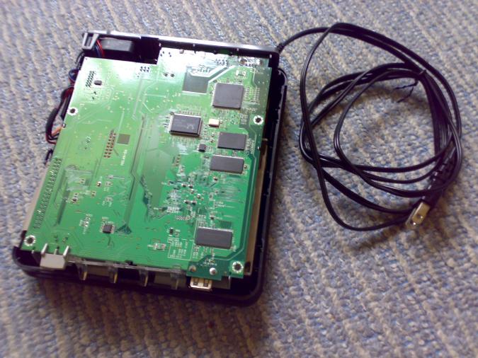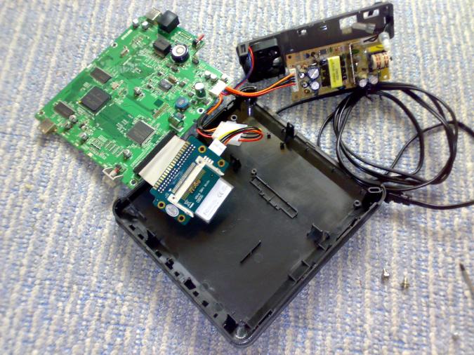 早速分解です。 タダで貰った A-DATAの4GBCF(X120)と 約200円電源変換コネクタ、及び 1480円のIDE-CF変換アダプタを使って・・・。 元通りに組付け完成! おまけ 通電すると変換アダプタが青色の光を発します、 それが玄箱の外に漏れ出して変な感じです。 (インテリアみたい)