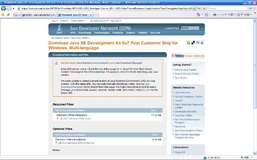 "JDK 6 Update 7"をダウンロードボタンをクリック。